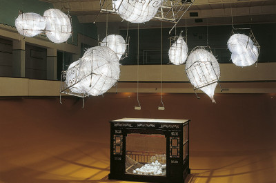 Chen Zhen - Field of Synergy 2000, Metal children's beds, plastic tubes, wooden Chinese bed, light bulbs, fan, polystyrene numbered balls, fabric, Plexiglas, motion sensor, 2000 x 1330 x 900 cm (approx.) Photo: Attilio Maranzano. © ADAGP, Paris