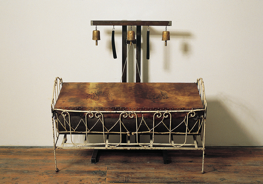 Chen Zhen - Un-interrupted Voice 1998, Metal children's bed, cowhide with drawings, wood, metal, string, rope, bells, 160 x 170 x 80 cm. Photo: Ela Bialkowska. © ADAGP, Paris