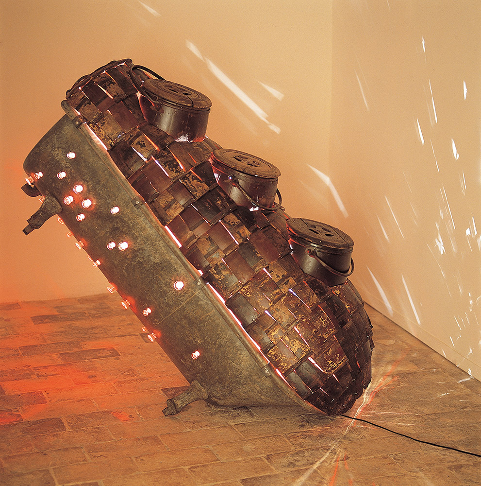 Chen Zhen - Bathroom 2000, Metal bathtube, Chinese chamber pots, metal, light bulbs, sound system, 105 x 70 x 100 cm. Photo: Ela Bialkowska. © ADAGP, Paris