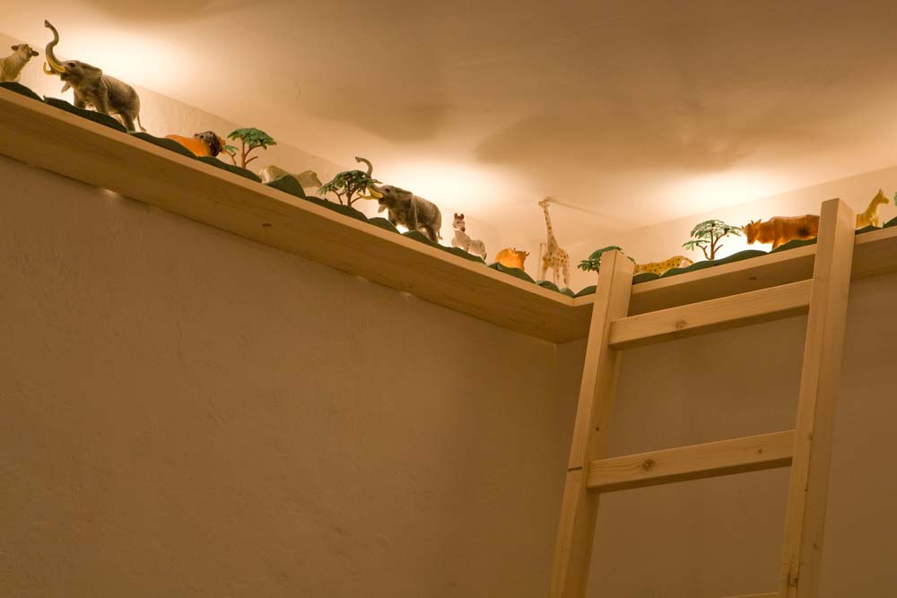 Ilya & Emilia Kabakov - The Paradise under the ceiling, 1997-2009, room with door, 2 wooden shelf 90°, 8 lamps, plastic animals, 300 x 420 x 250 cm, Photo Ela Bialkowska