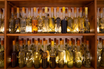 José Yaque - Tumba Abierta 2020, glass bottles, water, plant residues, 110 x 40 x 45 cm. Photo: Giovanni De Angelis