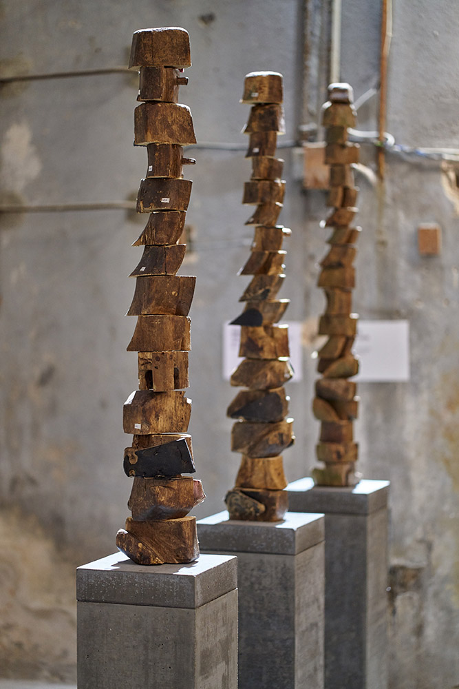 Yoan Capote - Erguidos / Upstanding 2020, Wooden yokes, concrete base and metal, 200 x 27 x 27 cm (each). Photo: Nestor Kim