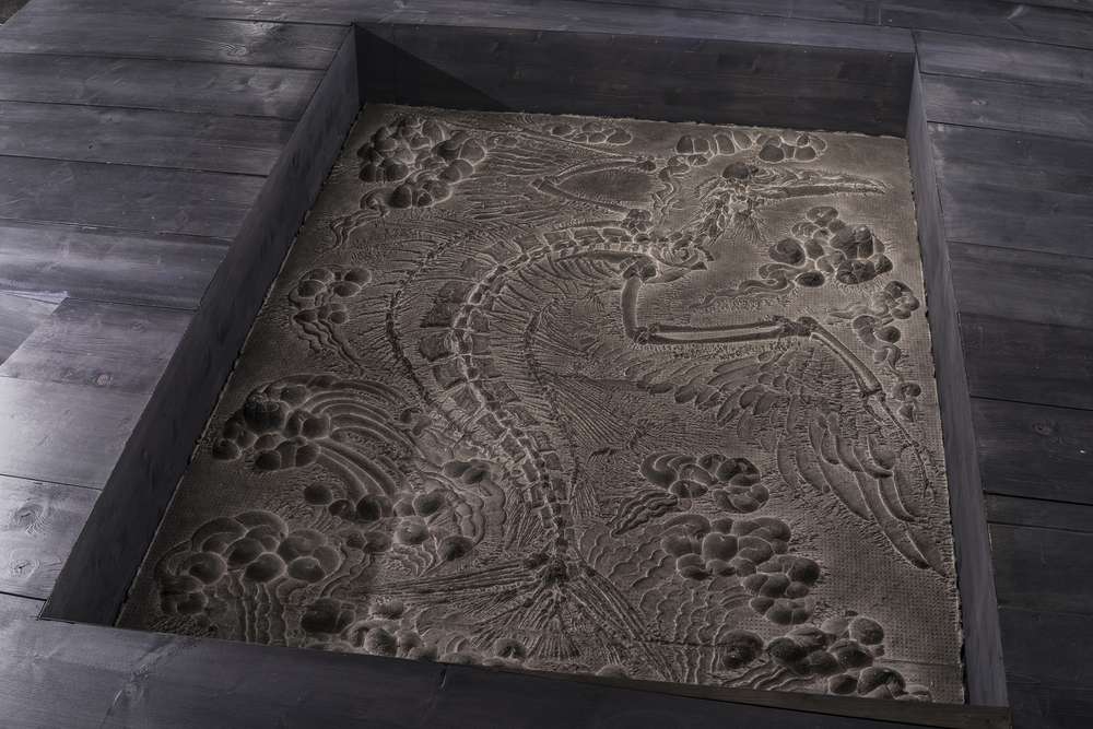 Qiu Zhijie - Gates of Empires, 2015, patterned paper relief, chinese ink, 447 x 197 cm (3 pieces of 149 x 197 cm each), Photo Ela Bialkowska