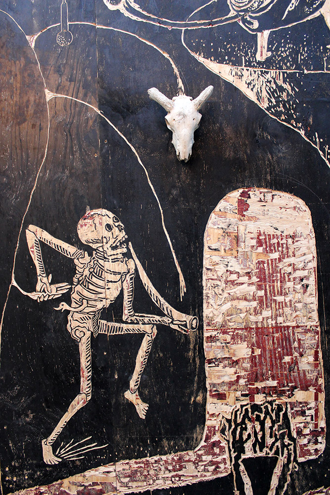 SPHÈRES 2011 - Damien Deroubaix, Höhle, 2010, Woodcut, ink and ramskull, 390 x 520 cm, Courtesy In situ, Fabienne Leclerc, Paris. Photo Alicia Luxem.
