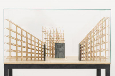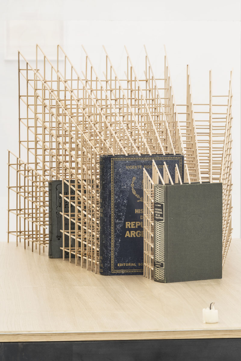 Jorge Macchi - Vanitas 01 2018, wooden rod structure, 3 books, candle, 138 x 73 x 146 cm. Photo Ela Bialkowska, OKNO Studio