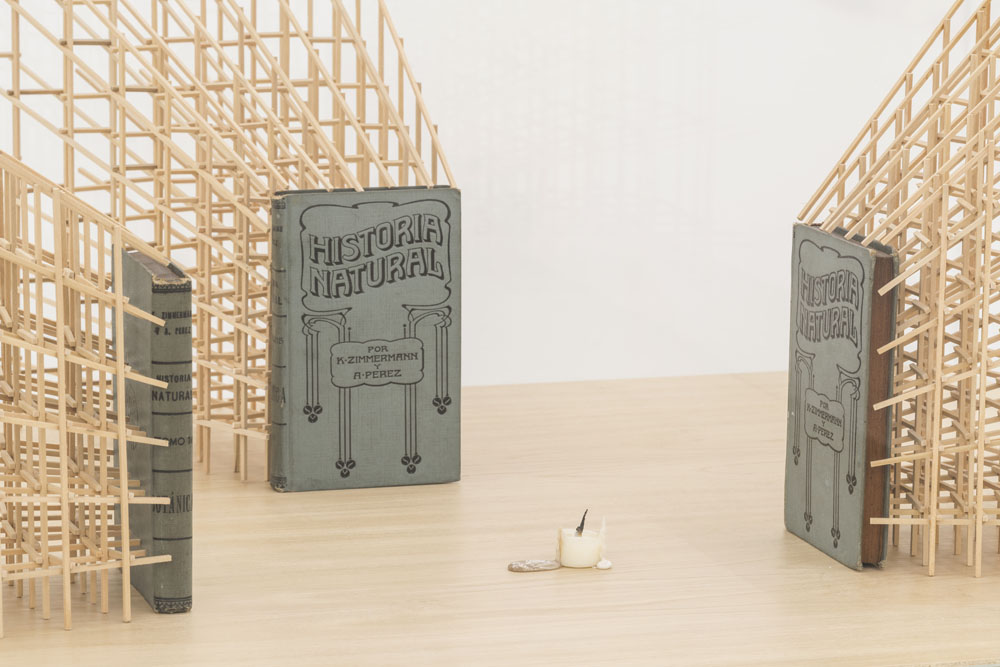 Jorge Macchi - Vanitas 02 2018, 3 wooden rod structures, 3 books, candle, 138 x 81 x 119 cm. Photo Ela Bialkowska, OKNO Studio