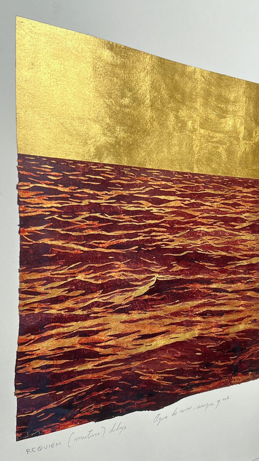 Requiem (martirio)2023 collective blood, sea water and 24k goldleaf on paper 56 x 76 cm 22.04 x 29.92 in unique work