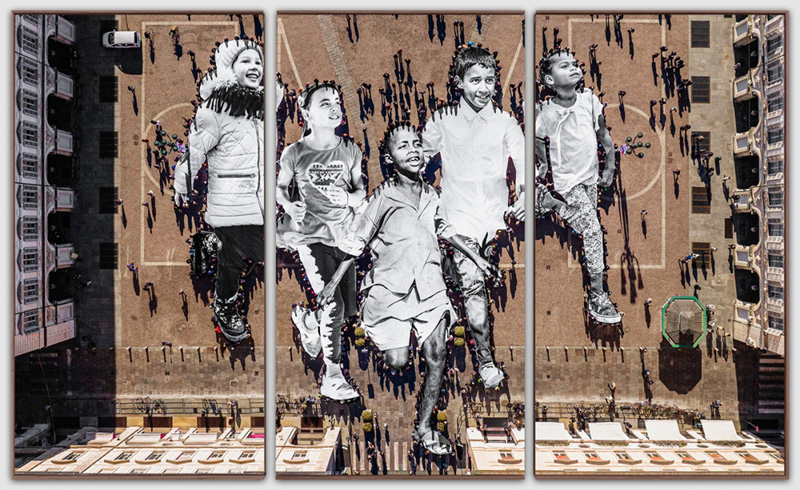 Déplacé·e·s is a series of images depicting the millions of children displaced around the world. For each image, JR and his team travelled to places where families sought refuge due to war and climate disasters, including Ukraine, Rwanda, Mauritania, Colombia, and Greece. With the help of the local community in each location, they unfurled an image of a refugee child on a 45-meter-long banner. First shown at Gallerie d'Italia in Turin in spring 2023, the exhibition will be presented in an enriched version, marking JR's first solo exhibition in the Nordic region.