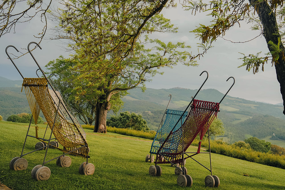 Nari Ward - Stallers - series, 2013, 19 strollers, reinforcement steel bars, hammocks, concrete, 235 x 140 x 80 cm each. Installation view at MITICO 2023, Castello di Casole, Tuscany. Photo Marco Valmarana