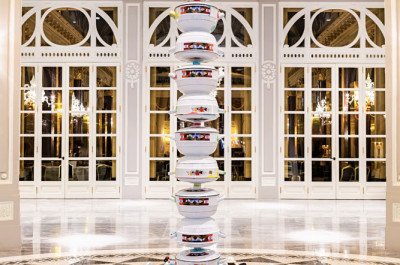 Pascale Marthine Tayou - Colonne coloniale 2015, glass sculptures made by Berengo Studio, Murano, Italia, column of enamelled pots. Ph. by The St. Regis Rome.
