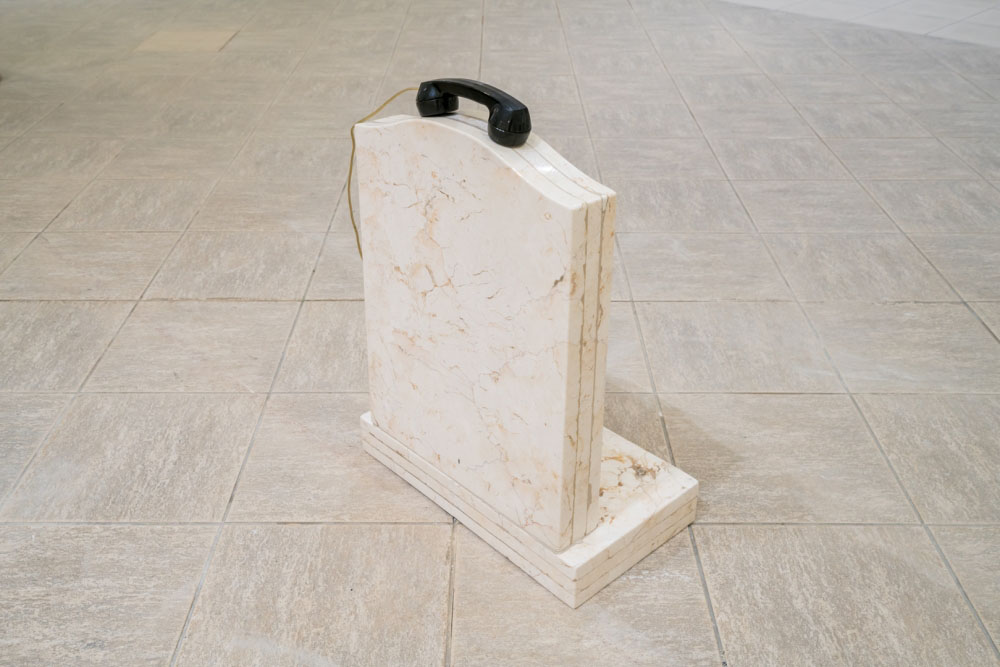 Sislej Xhafa - Sister 2013, white tombstone with telephone receiver, 85 x 60 x 30 cm. Photo: Nestor Kim