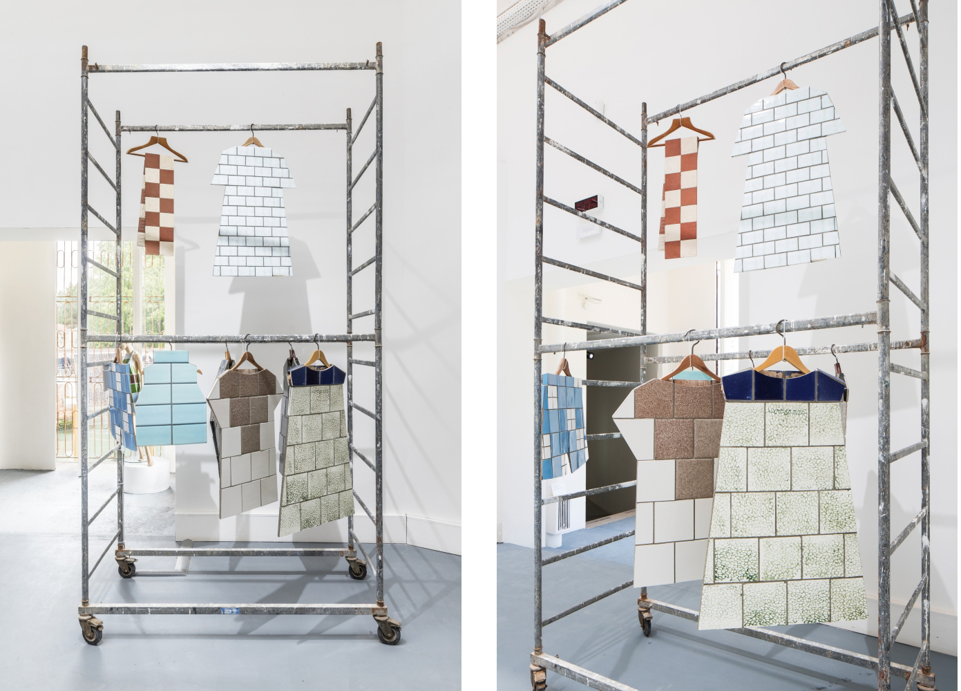 The relationship between architecture and mosaic has been a preoccupation of the artist throughout her career; the artist’s home country, Ukraine, has an extensive history of producing ceramic tiles. The artist started “Second Hand” shortly before Ukraine began its decommunization in April of 2015. For some iterations of this project before the 2019 Venice Biennale, Kadyrova used tiles from Soviet-era non-operational industrial buildings, adding another meaning to the title which not only refers to the sartorial form that Kadyrova manipulates these tiles into, but also the reused nature of the material, giving new structure, form and therefore meaning to them that are reminiscent of a prolific and effecting historic period.